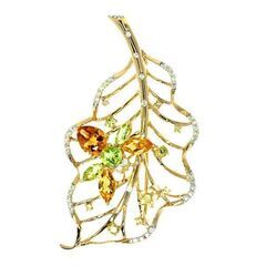 Золотая брошь 585 пробы, камни - бриллиант - 44шт. вес 0.31 карата, цветные полудраг камни - 21шт. вес 3.68 карата
