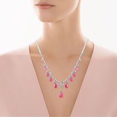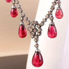 Золотое колье 750 пробы, камни - бриллиант цветной огранка круглая 57 граней - 66шт. вес 7.67 карата, турмалин - 9шт. вес 42.43 карата