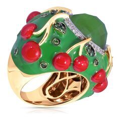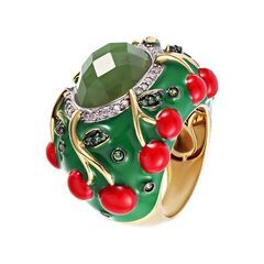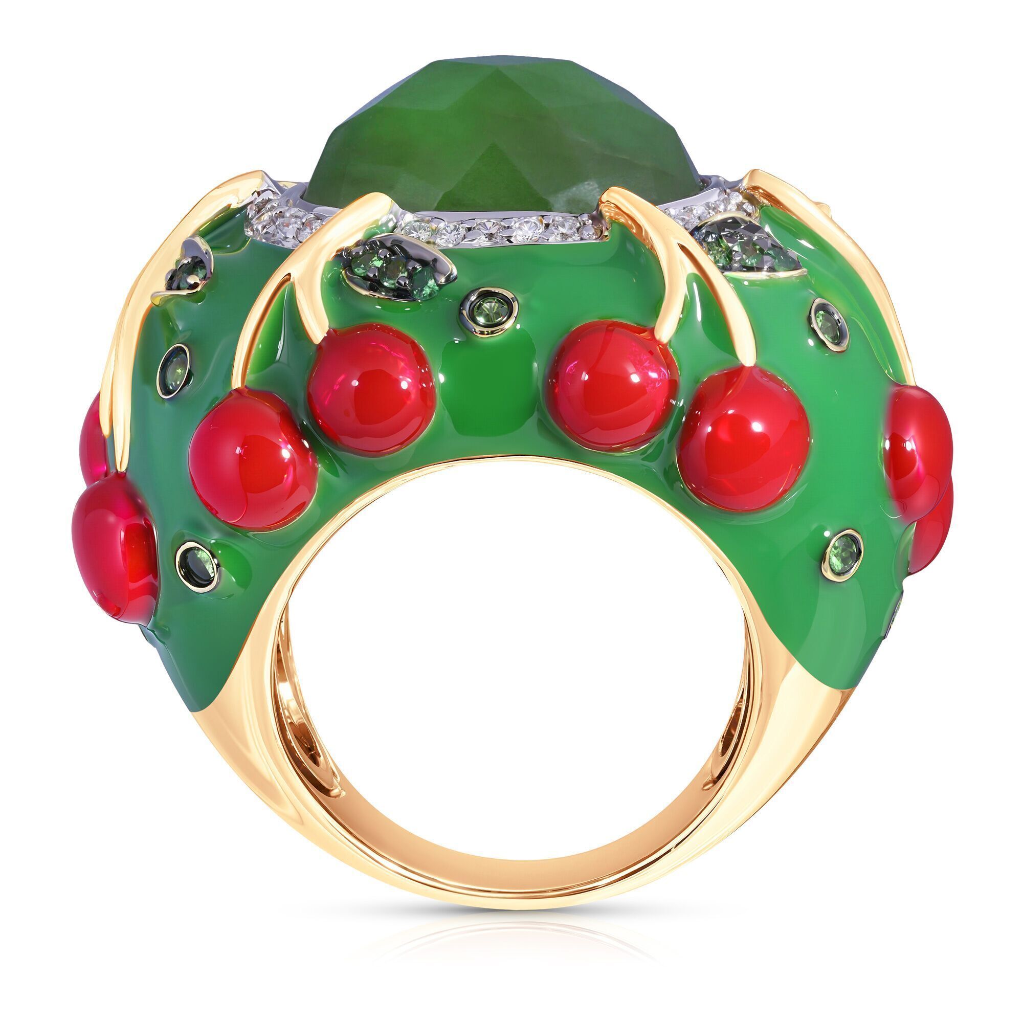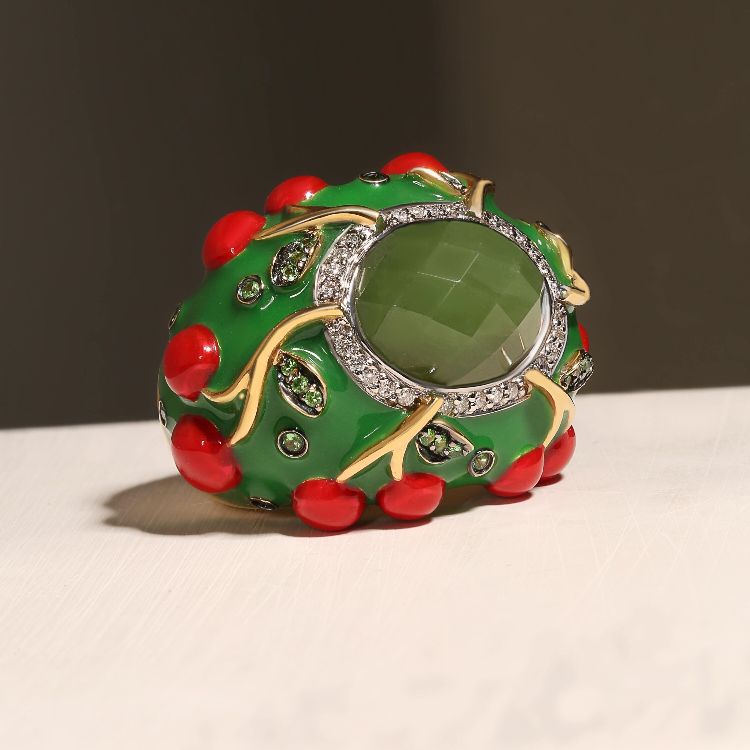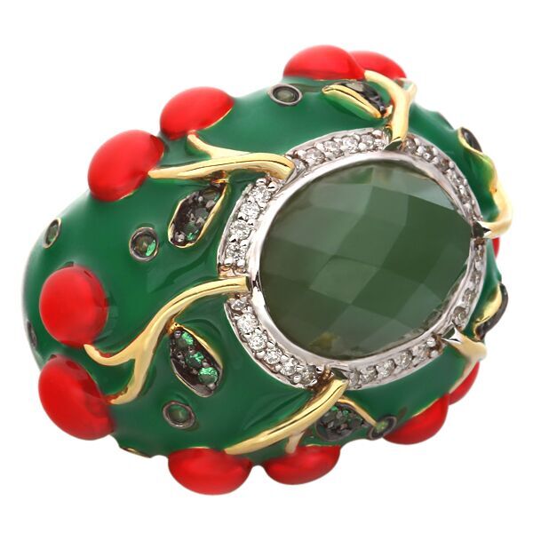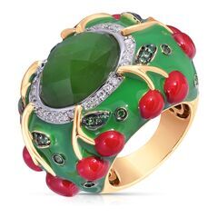Кольцо из золота 750 пробы с жадеитом, бриллиантами, цаворитами и эмалью (18) (ягоды) код. 25331