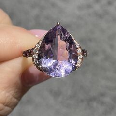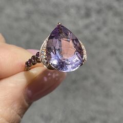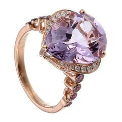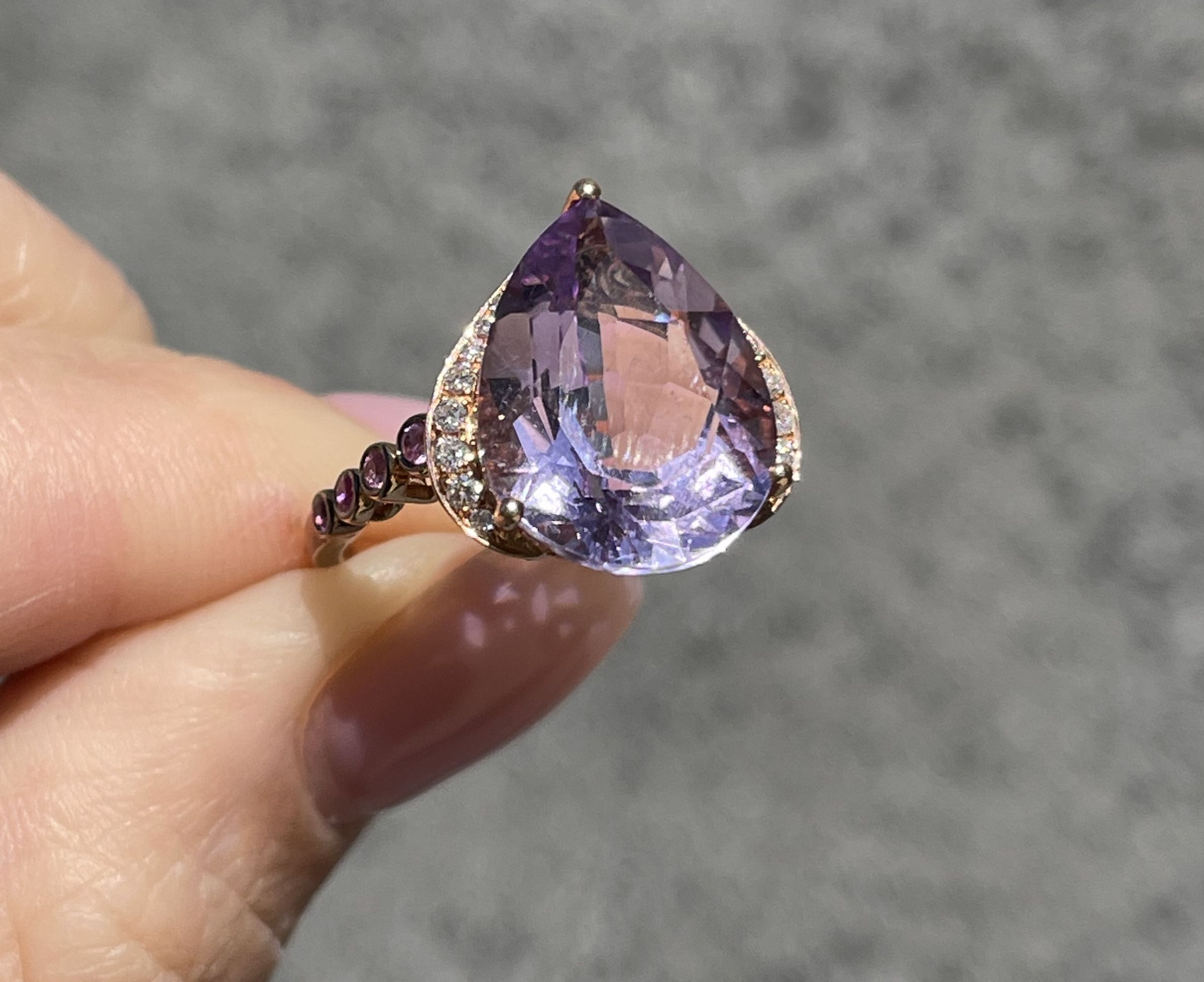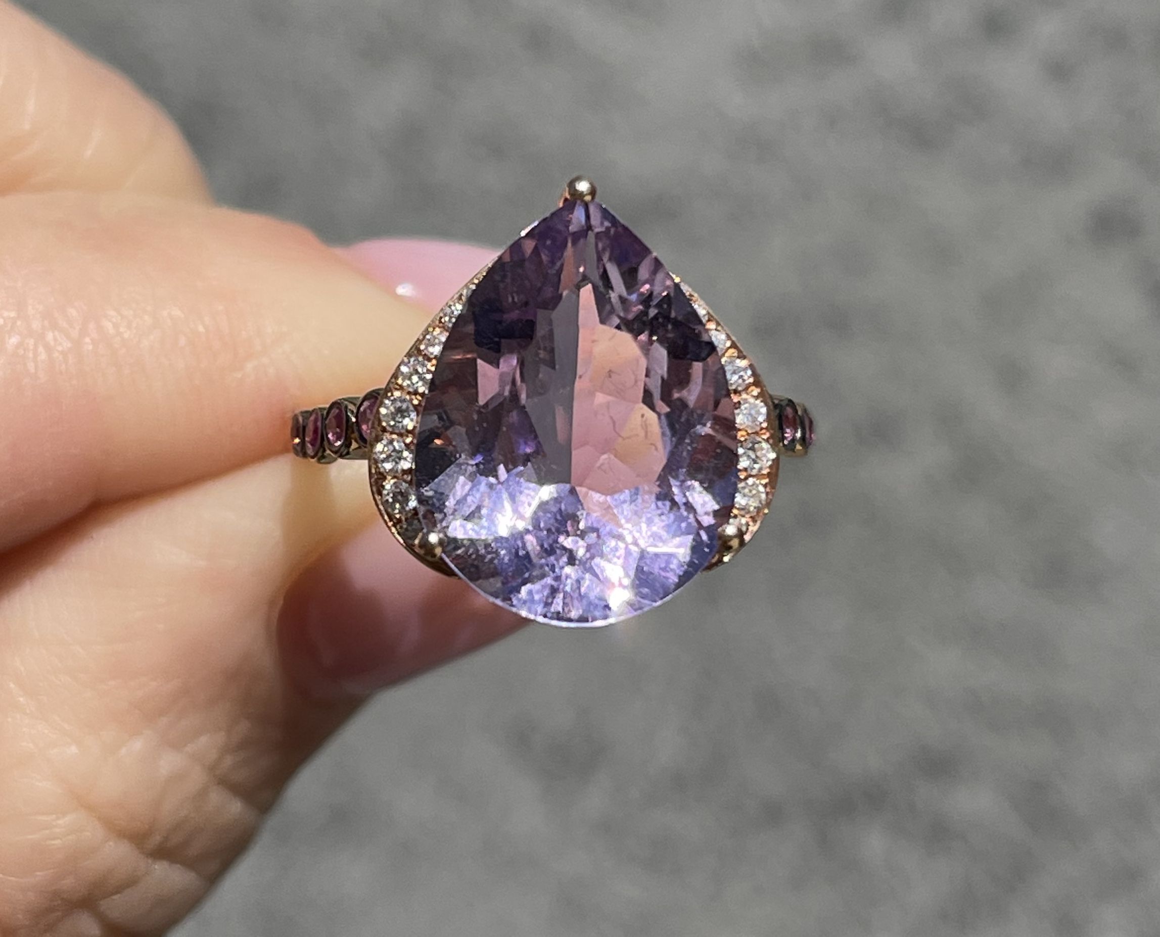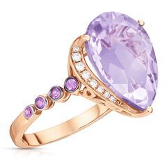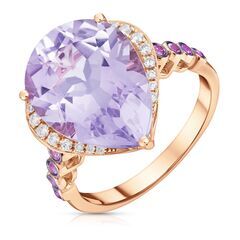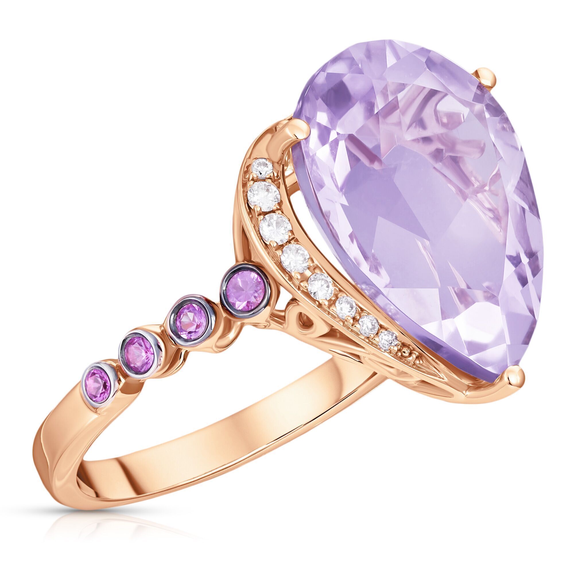 Золотое кольцо 585 пробы, камни - бриллиант огранка круглая 57 граней 3/5 - 16шт. вес 0.16 карата, сапфир розовый - 8шт. вес 0.19 карата, аметист - 1шт. вес 8.20 карата