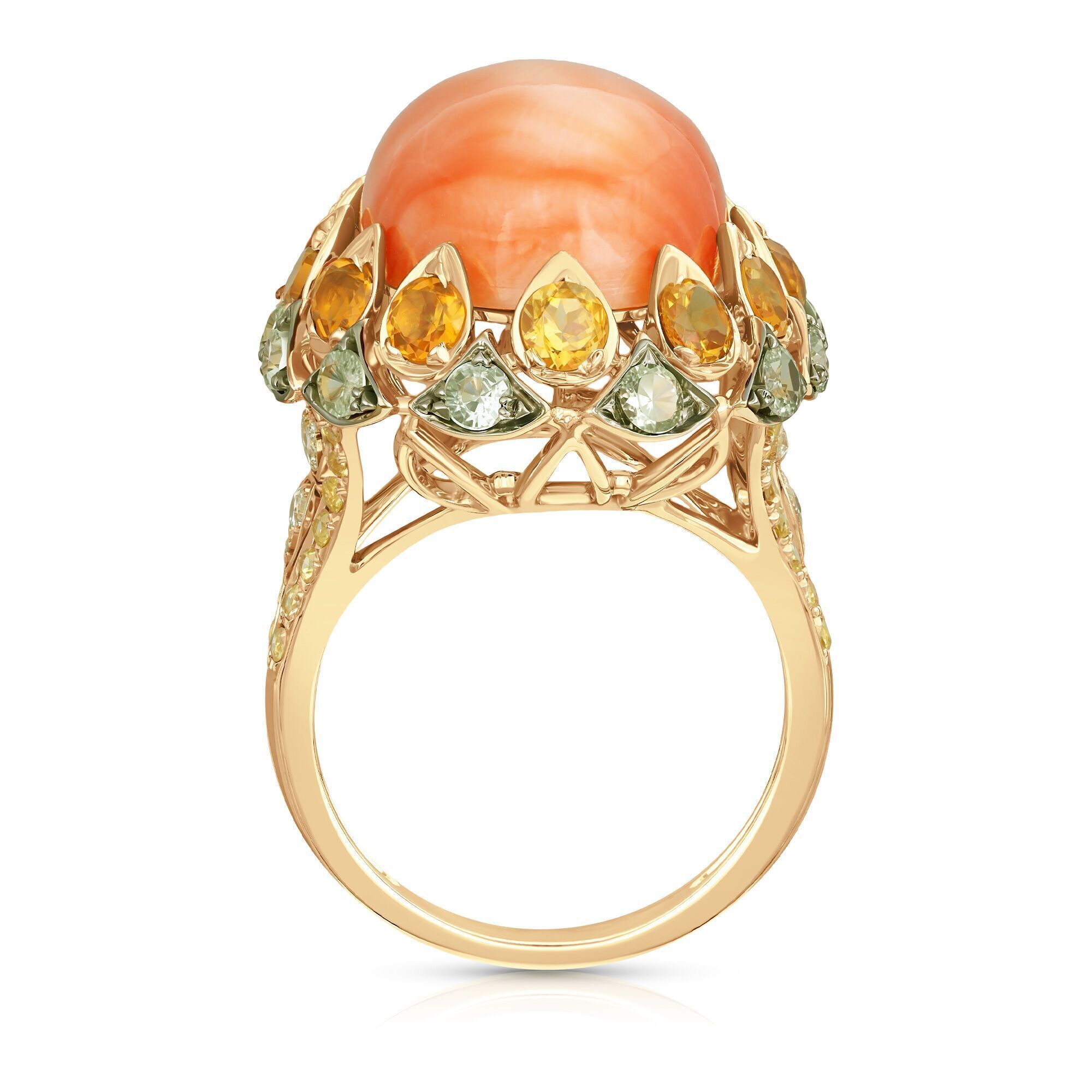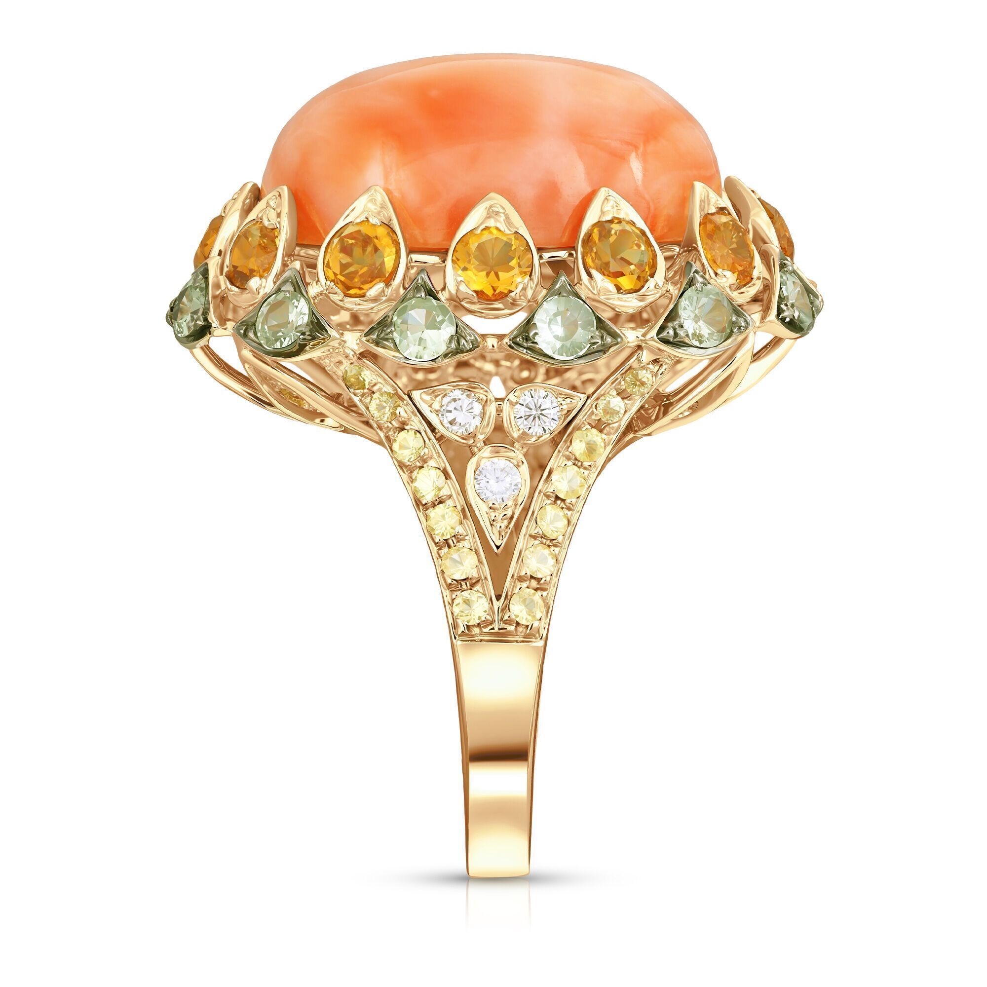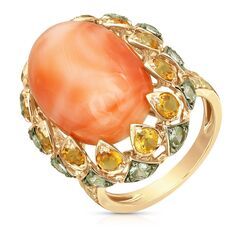 Золотое кольцо 585 пробы, камни - бриллиант огранка круглая 57 граней 3/6 - 6шт. вес 0.15 карата, сапфир цветной - 40шт. вес 1.30 карата, цитрин - 12шт. вес 1.40 карата, коралл - 1шт. вес 13.84 карата
