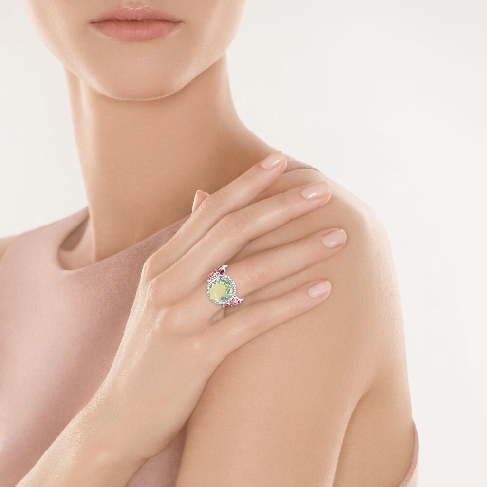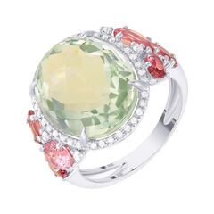 Кольцо из белого золота 585 пробы с празиолитом, бриллиантами и турмалинами (17,5)