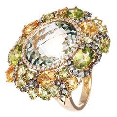 Золотое кольцо 585 пробы, камни - бриллиант огранка круглая 57 граней 3/5 - 36шт. вес 0.25 карата, сапфир зеленый - 54шт. вес 0.98 карата, цитрин - 6шт. вес 1.80 карата, перидот - 29шт. вес 8.60 карата, празиолит - 1шт. вес 14.70 карата