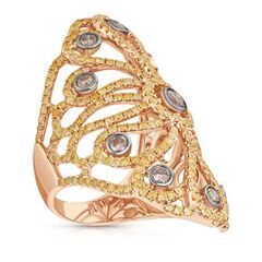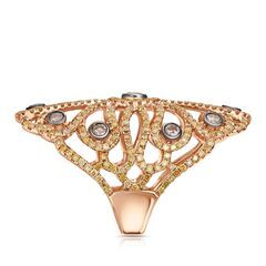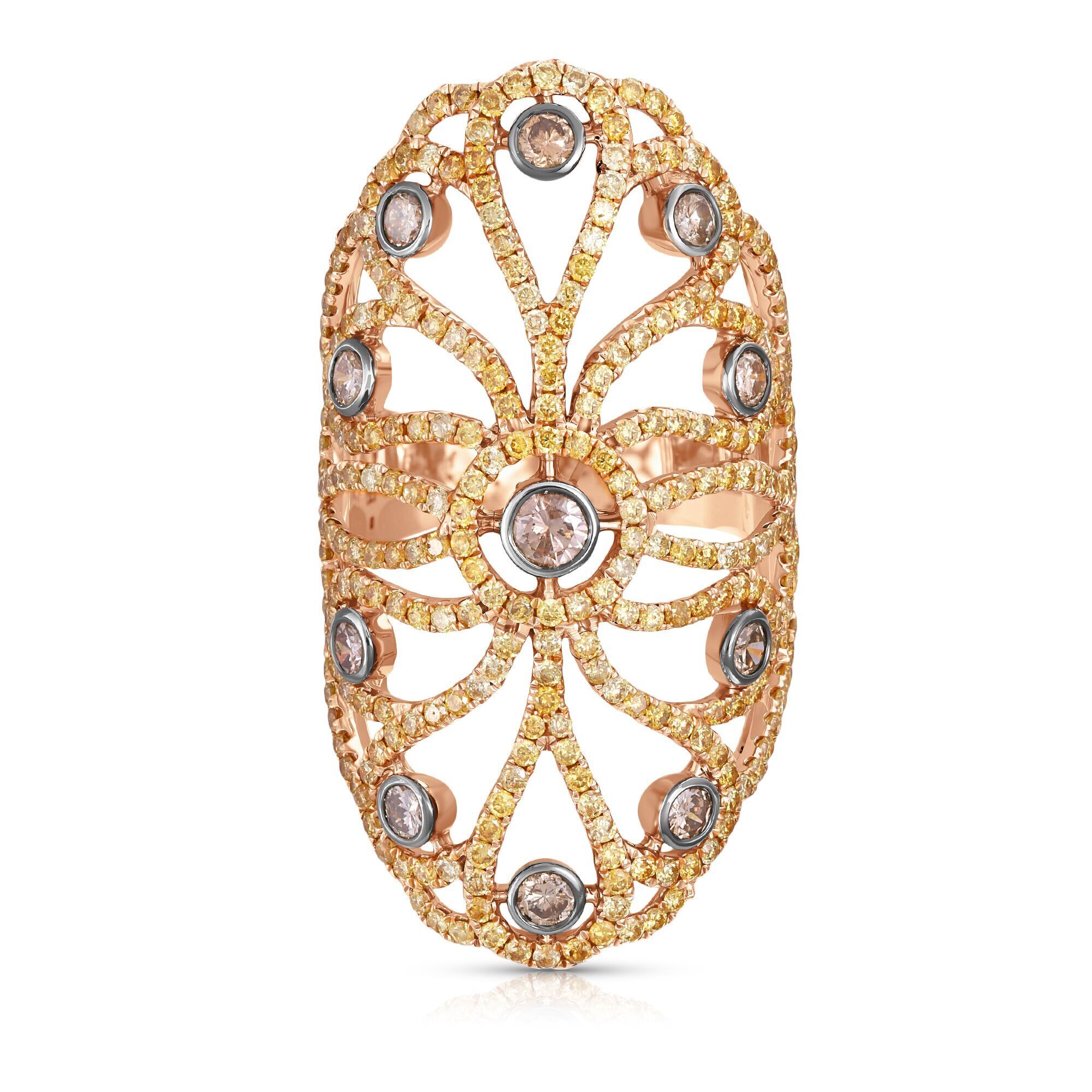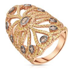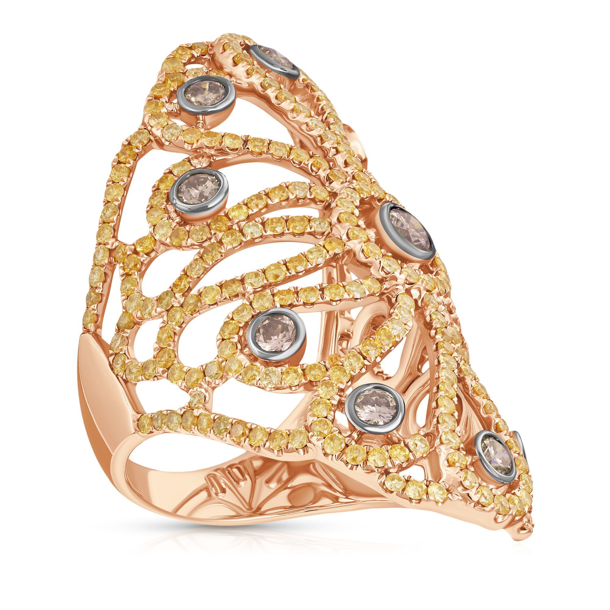 Золотое кольцо 750 пробы, камни - бриллиант коричневый огранка круглая 57 граней 7/6 - 11шт. вес 0.86 карата, бриллиант облагороженный желтый огранка круглая 57 граней 5/4 - 304шт. вес 2.19 карата