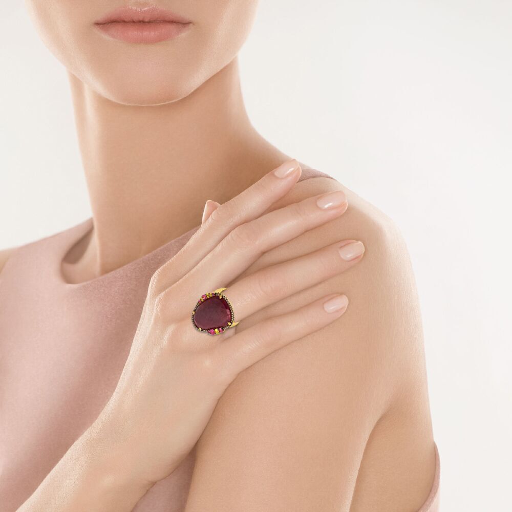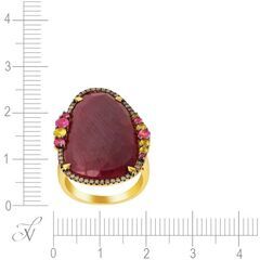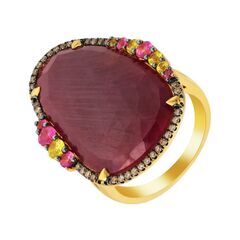 Золотое кольцо 585 пробы, камни - бриллиант коричневый огранка круглая 57 граней 7/5 - 35шт. вес 0.20 карата, сапфир цветной - 11шт. вес 0.69 карата, корунд - 1шт. вес 17.00 каратов