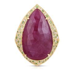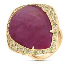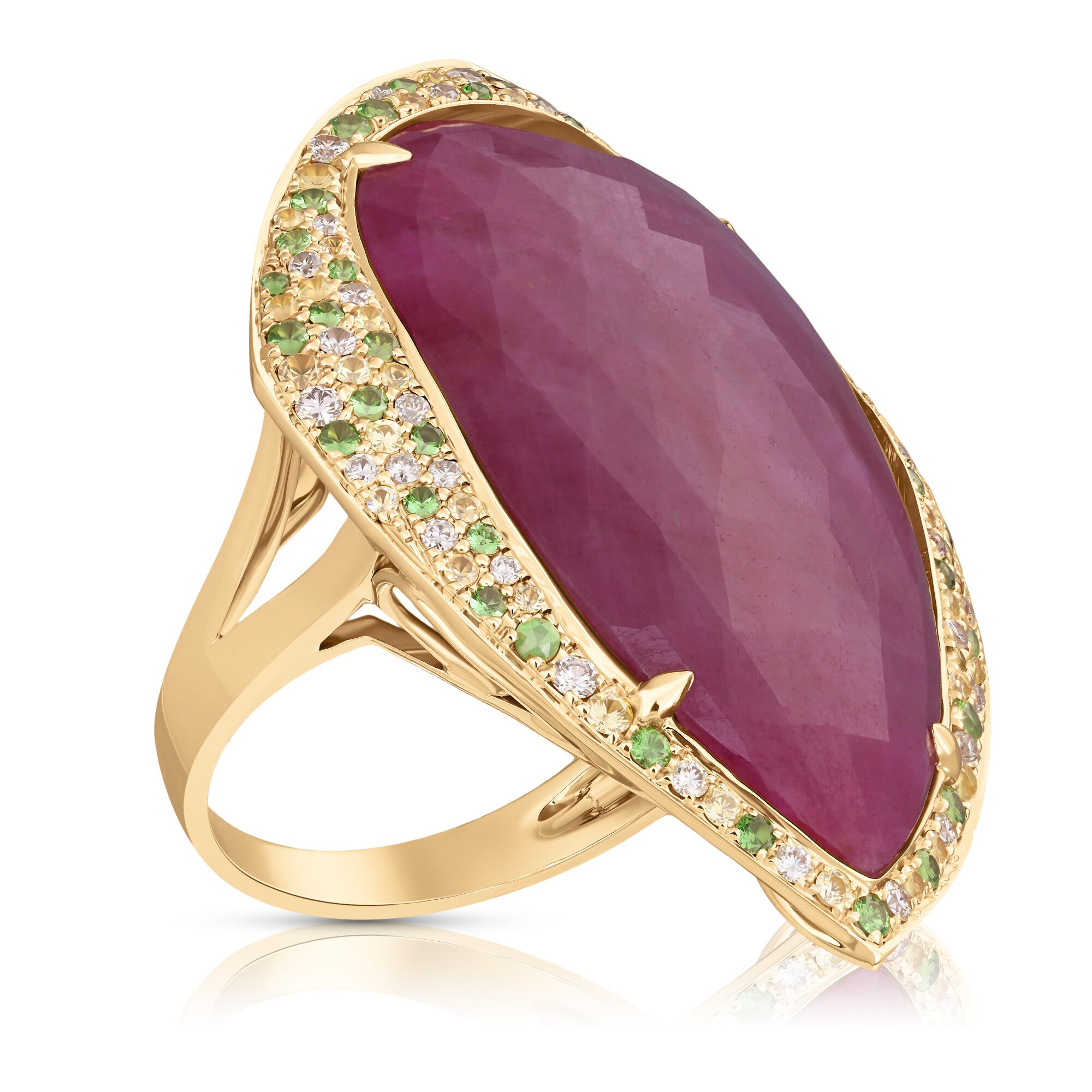 Золотое кольцо 585 пробы, камни - бриллиант коричневый огранка круглая 57 граней 6/6 - 37шт. вес 0.40 карата, цаворит - 40шт. вес 0.48 карата, сапфир желтый - 39шт. вес 0.42 карата, корунд - 1шт. вес 33.98 карата
