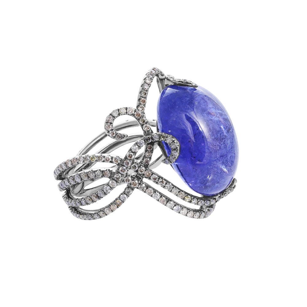 Золотое кольцо 750 пробы, камни - бриллиант цветной огранка круглая 57 граней 7/6 - 235шт. вес 1.19 карата, танзанит овал - 1шт. вес 24.41 карата