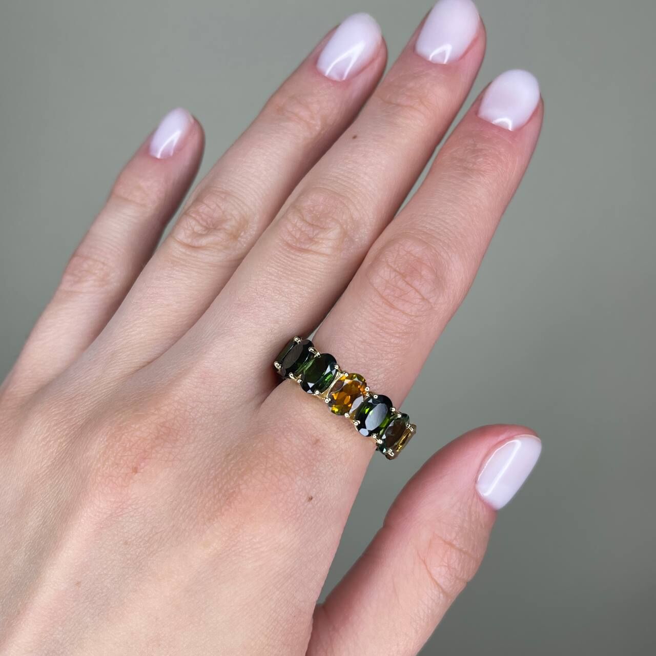 Золотое кольцо 585 пробы, камни - турмалин овал - 14шт. вес 10.94 карата