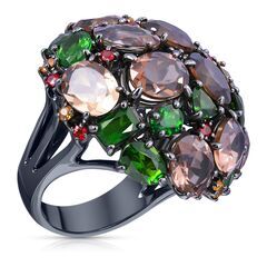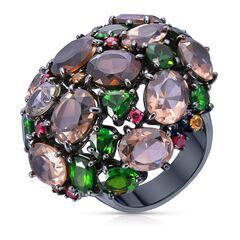Серебряное кольцо 925 пробы, камни - раухтопаз - 12шт. вес 24.00 карата, сапфир оранжевый - 9шт. вес 0.18 карата, сапфир желтый - 8шт. вес 0.16 карата, хромдиопсид - 12шт. вес 15.00 каратов