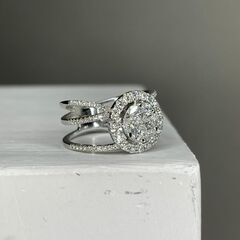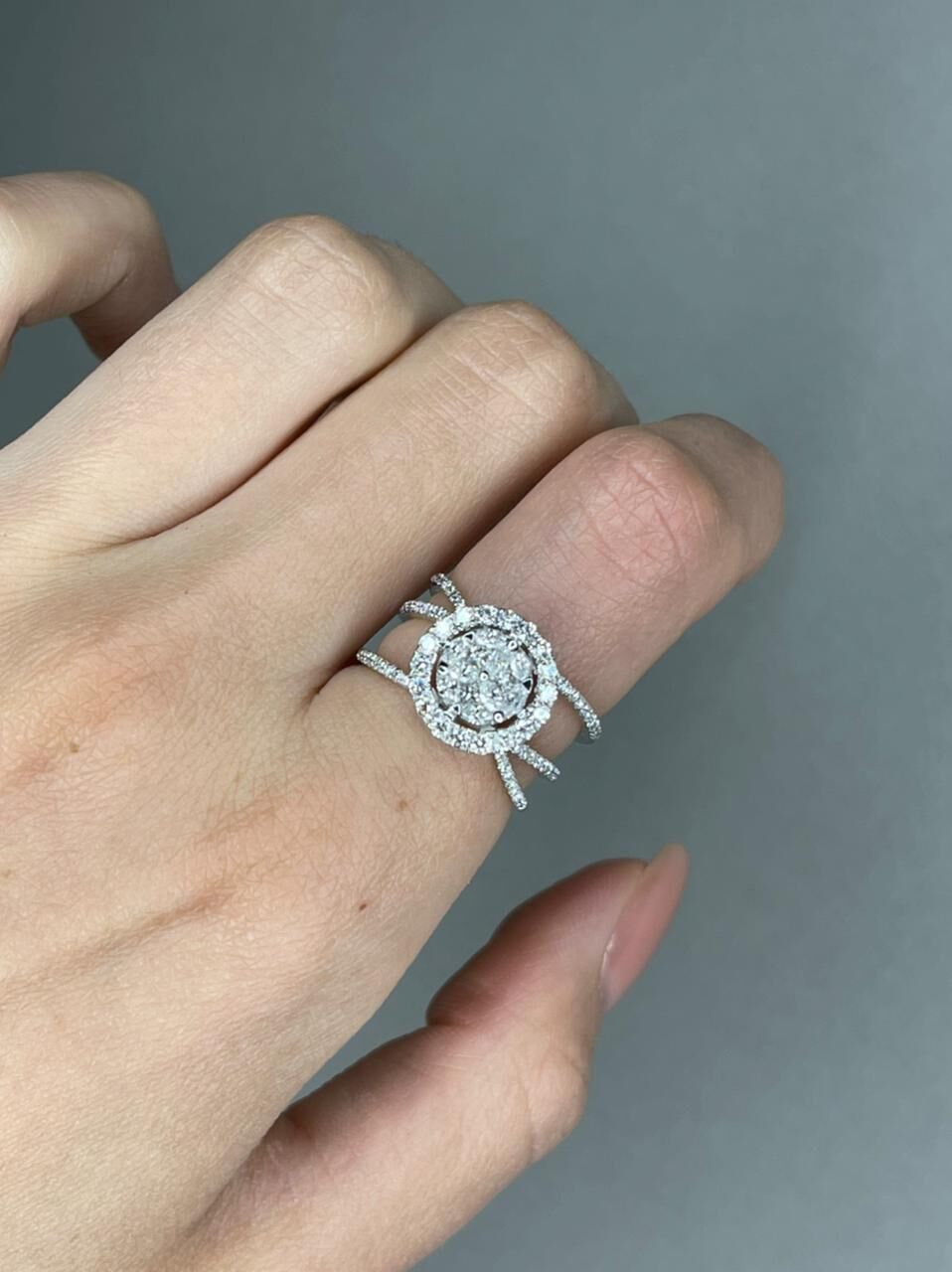Золотое кольцо 750 пробы, камни - бриллиант огранка принцесса 57 граней 4/5 - 3шт. вес 0.12 карата, бриллиант огранка маркиз 55 граней 3-4/5-6 - 9шт. вес 0.27 карата, бриллиант огранка круглая 57 граней 4/5 - 18шт. вес 0.35 карата, бриллиант огранка круглая 57 граней 4/5 - 54шт. вес 0.22 карата