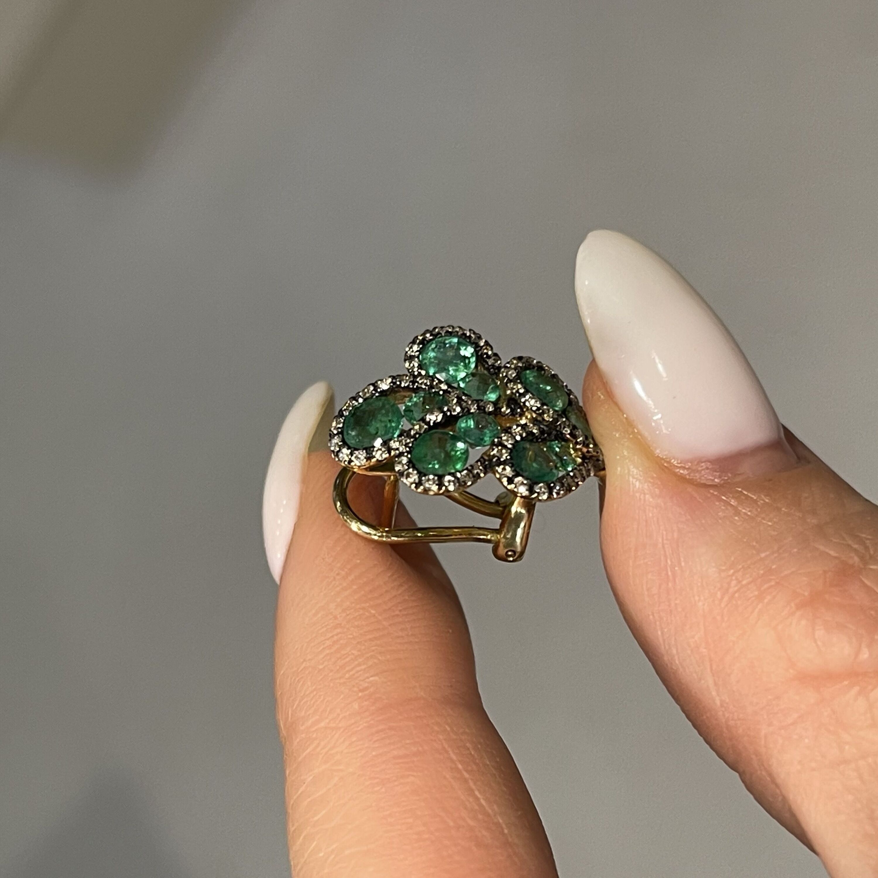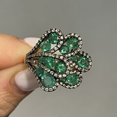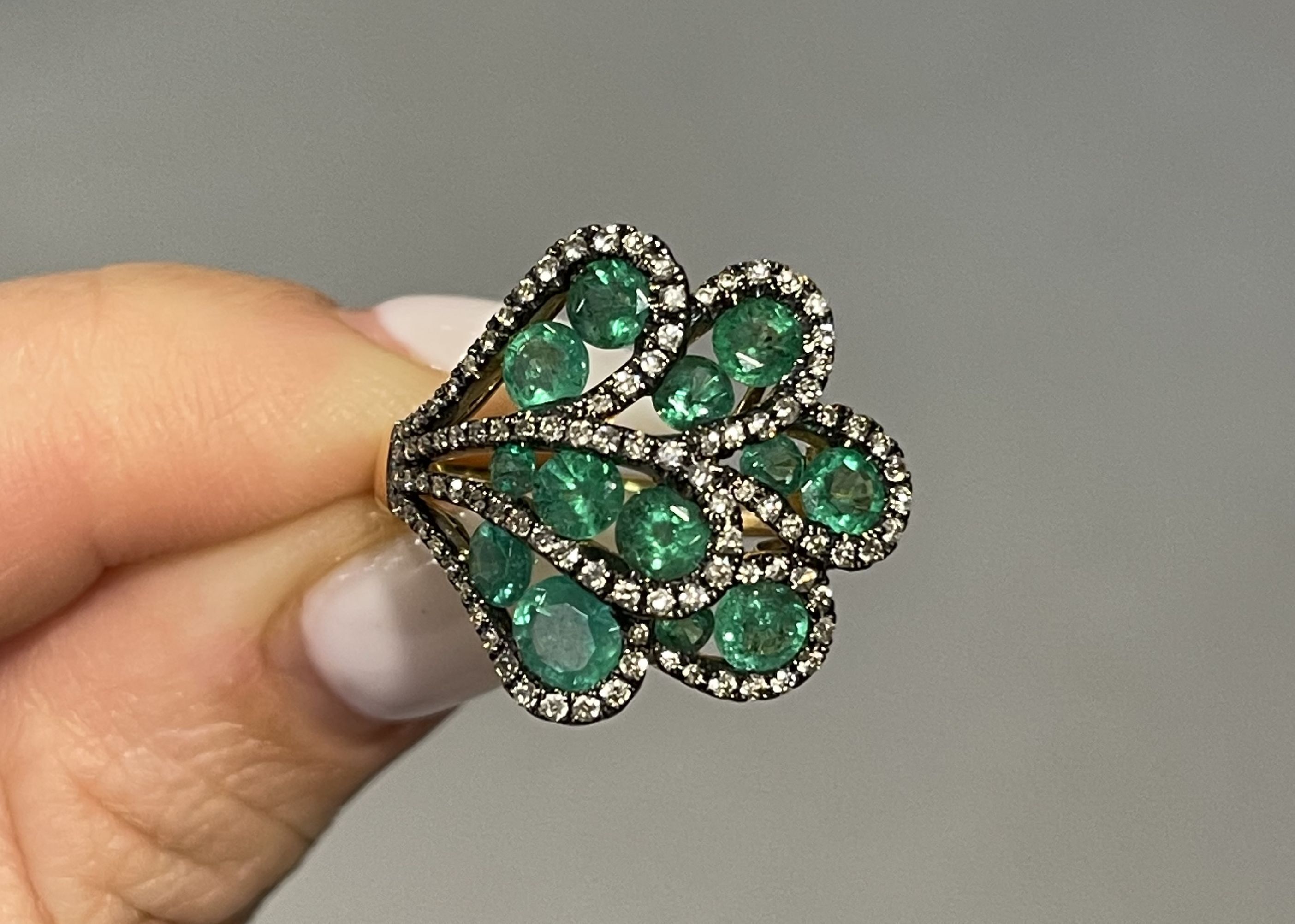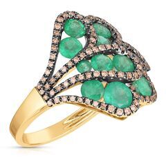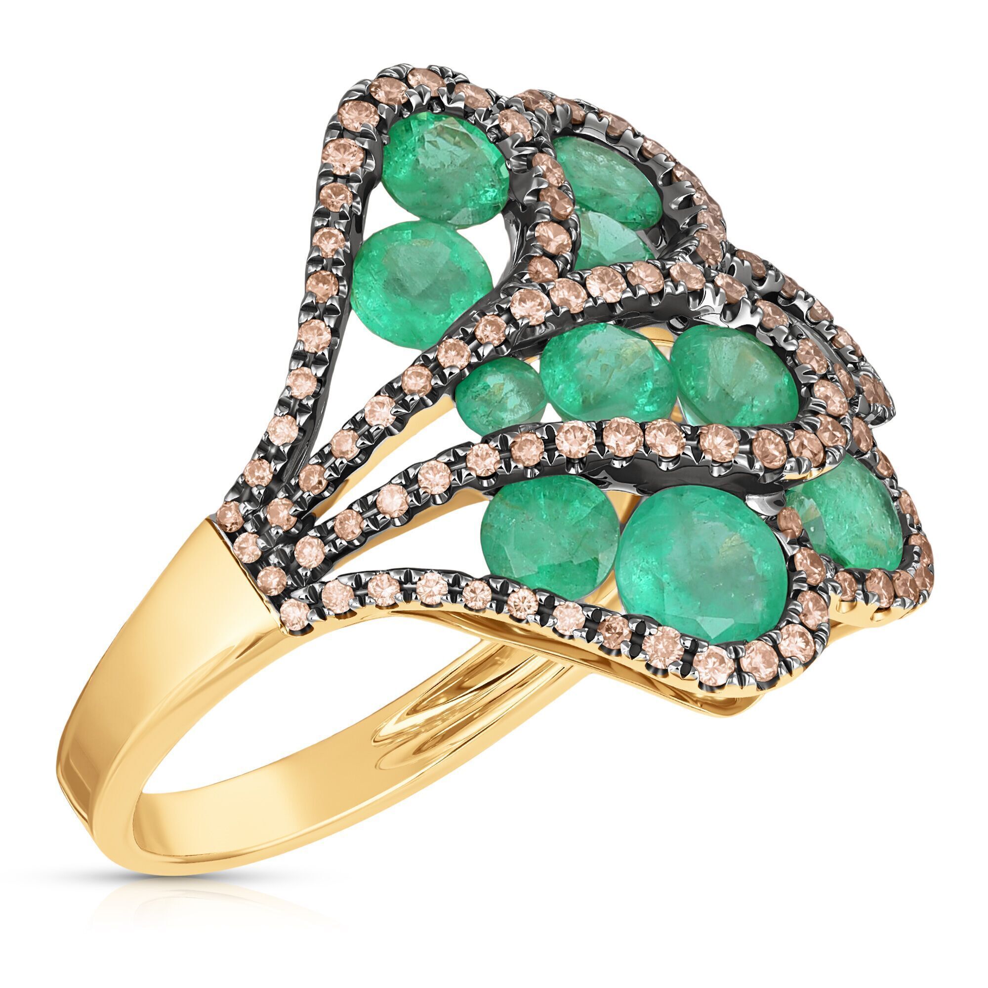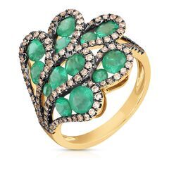 Золотое кольцо 585 пробы, камни - бриллиант коричневый огранка круглая 57 граней 6/6 - 112шт. вес 0.55 карата, изумруд 3/г2 - 13шт. вес 2.90 карата