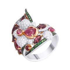 Золотое кольцо 750 пробы, камни - бриллиант огранка круглая 57 граней 4/6 - 95шт. вес 0.93 карата, родолит - 12шт. вес 3.00 карата, турмалин розовый - 2шт. вес 1.20 карата, цаворит - 58шт. вес 0.69 карата