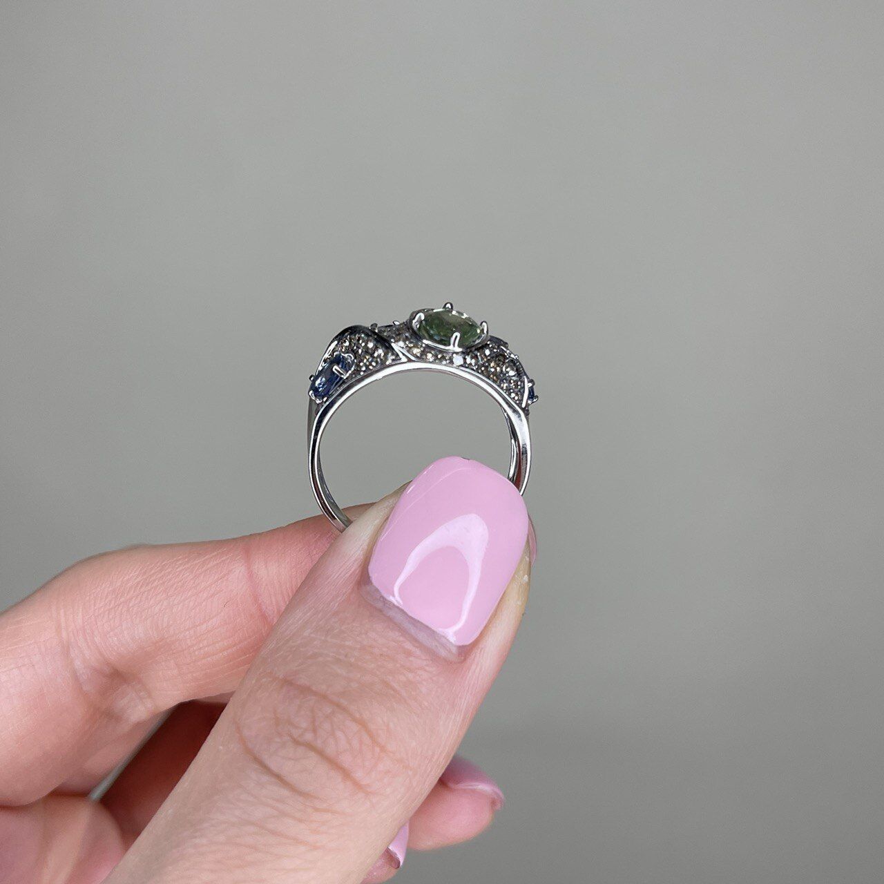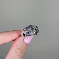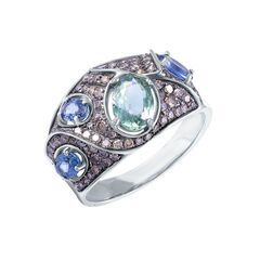 Золотое кольцо 585 пробы, камни - бриллиант коричневый огранка круглая 57 граней 7/5 - 36шт. вес 0.50 карата, бриллиант коричневый огранка круглая 17 граней 4/3 - 50шт. вес 0.25 карата, сапфир зеленый - 1шт. вес 0.96 карата, сапфир голубой - 3шт. вес 0.85 карата