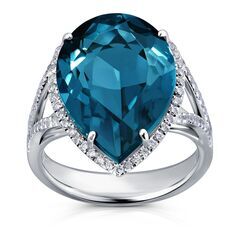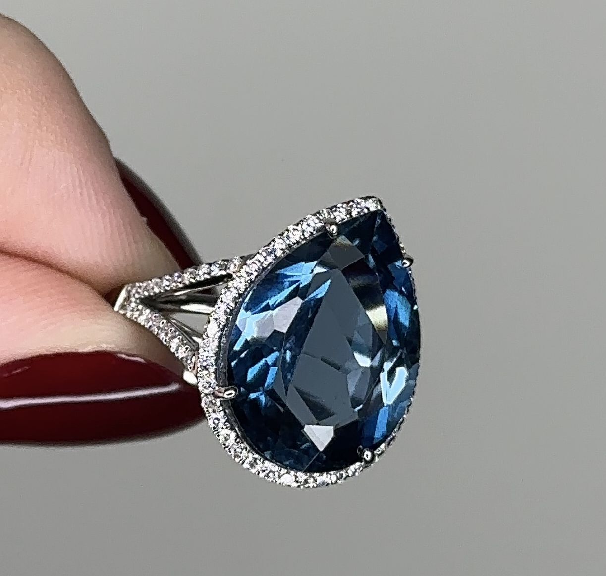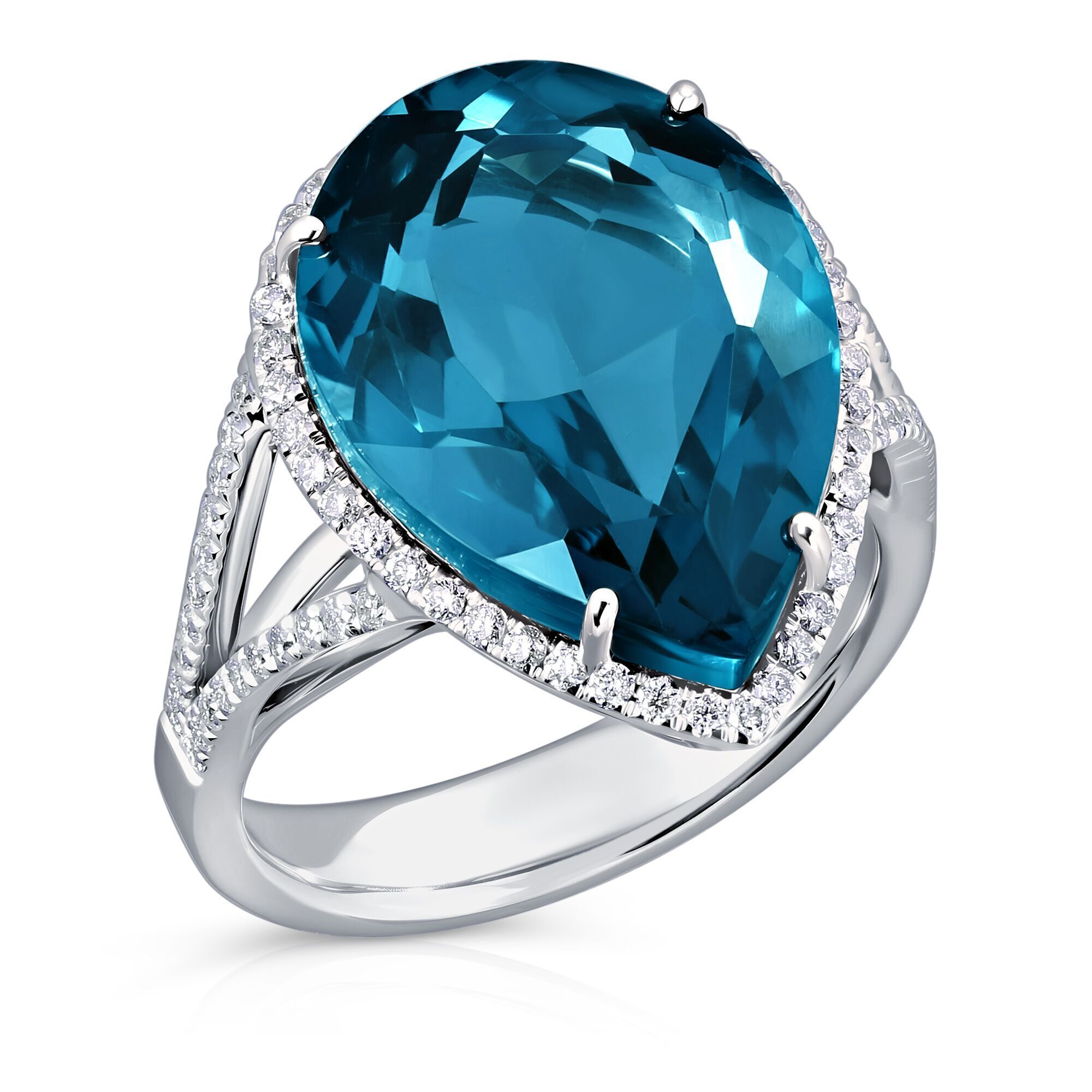 Золотое кольцо 585 пробы, камни - бриллиант белый огранка круглая 57 граней 3/6 - 82шт. вес 0.49 карата, топаз лондонский груша - 1шт. вес 15.95 карата