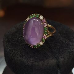Золотое кольцо 585 пробы, камни - бриллиант белый огранка круглая 57 граней 4/6 - 4шт. вес 0.14 карата, сапфир розовый - 6шт. вес 0.24 карата, цаворит зеленый - 16шт. вес 0.66 карата, дублет ам/перл фиолетовый овал - 1шт. вес 24.91 карата