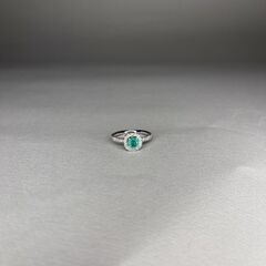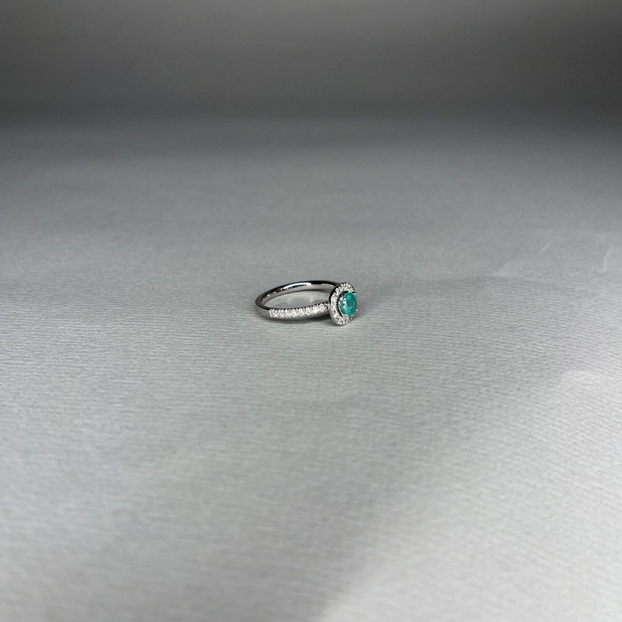 Золотое кольцо 585 пробы, камни - изумруд зеленый 3/г3 - 1шт. вес 0.41 карата, бриллиант белый огранка круглая 57 граней 4/5 - 28шт. вес 0.23 карата