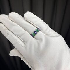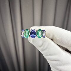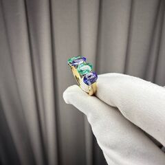 Золотое кольцо 585 пробы, камни - изумруд зеленый 3/г3 - 2шт. вес 1.42 карата, танзанит сиреневый - 3шт. вес 2.13 карата