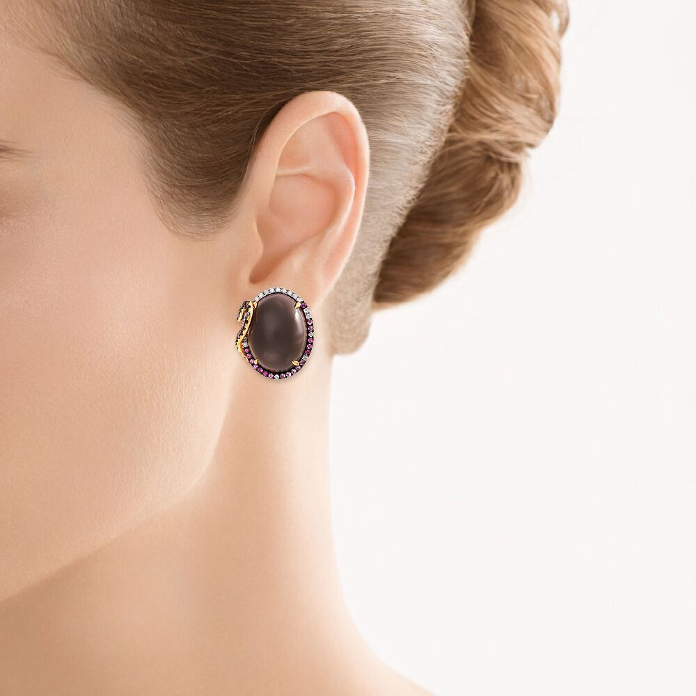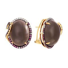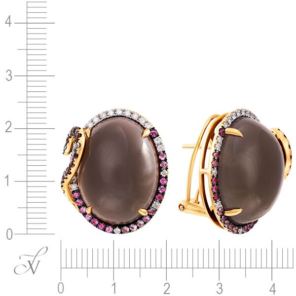 Золотые серьги 585 пробы, камни - бриллиант огранка круглая 57 граней 4/6 - 44шт. вес 0.38 карата, сапфир розовый - 36шт. вес 0.45 карата, сапфир цветной - 34шт. вес 0.64 карата, халцедон - 2шт. вес 37.68 карата