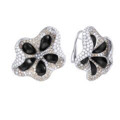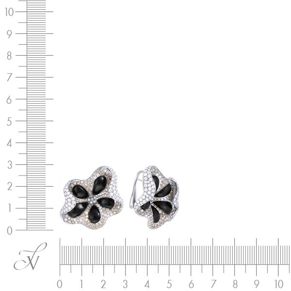Серьги из черного золота 750 пробы с ониксом и бриллиантами (цветы) код. 24668