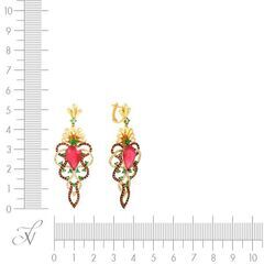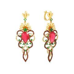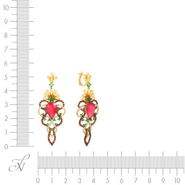 Золотые серьги 585 пробы, камни - сапфир цветной - 220шт. вес 1.20 карата, цаворит - 36шт. вес 0.78 карата, рубин с/г2 - 2шт. вес 7.70 карата