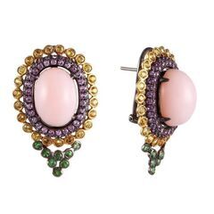 Золотые серьги 750 пробы, камни - опал розовый - 2шт. вес 11.64 карата, сапфир розовый - 122шт. вес 1.84 карата, цаворит - 16шт. вес 0.44 карата, сапфир - 46шт. вес 1.50 карата