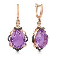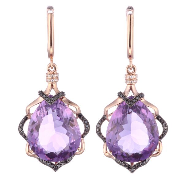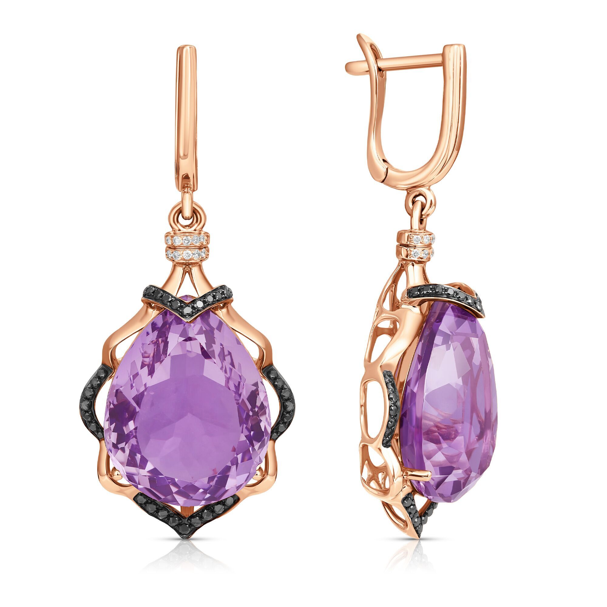 Золотые серьги 585 пробы, камни - бриллиант огранка круглая 57 граней 4/6 - 20шт. вес 0.06 карата, бриллиант облагороженный черный огранка круглая 57 граней 7/6 - 72шт. вес 0.16 карата, аметист - 2шт. вес 30.34 карата