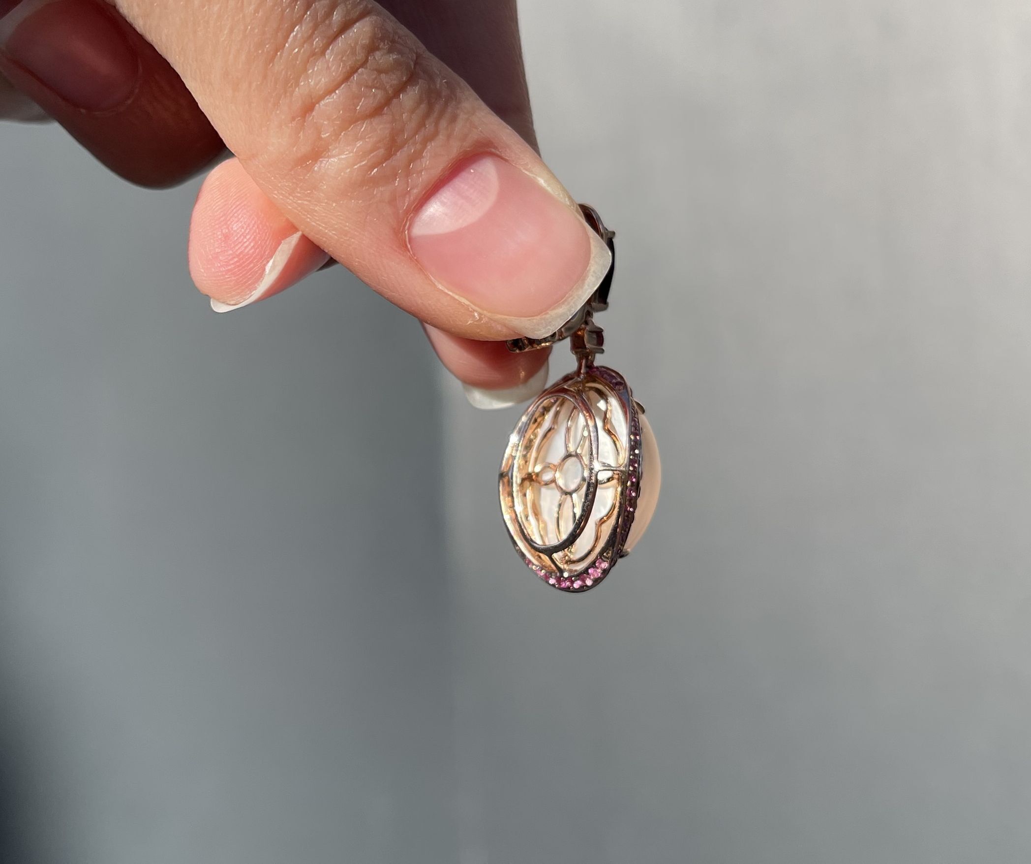 Золотые серьги 585 пробы, камни - рубин 3/г3 - 38шт. вес 0.40 карата, сапфир розовый - 108шт. вес 1.25 карата, родолит - 4шт. вес 2.60 карата, дублет роз.кв/перл розовый - 2шт. вес 27.04 карата