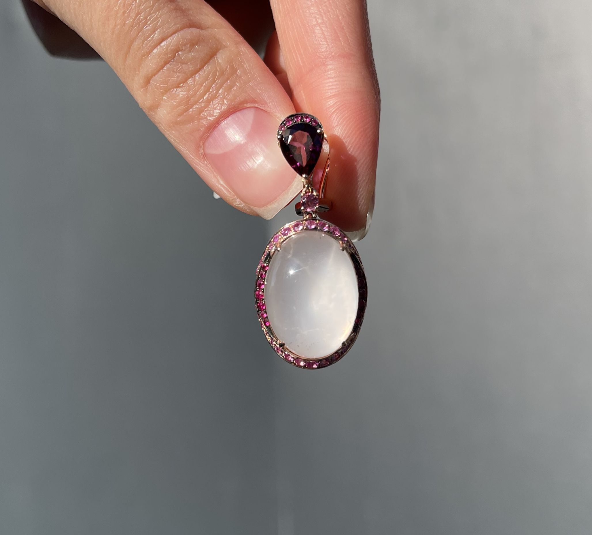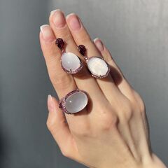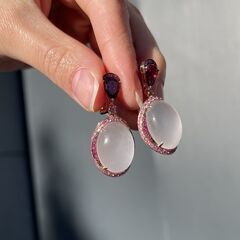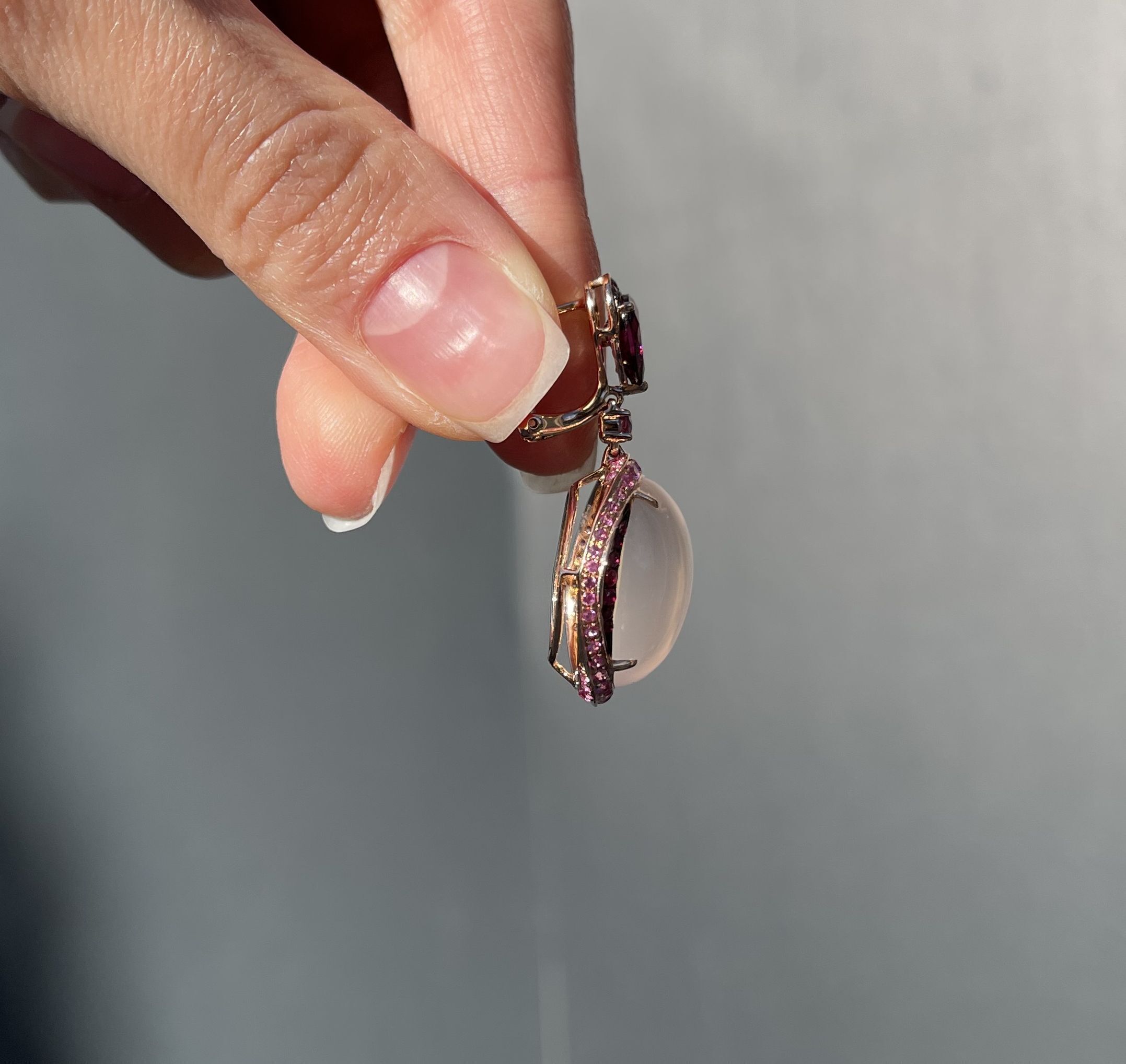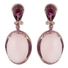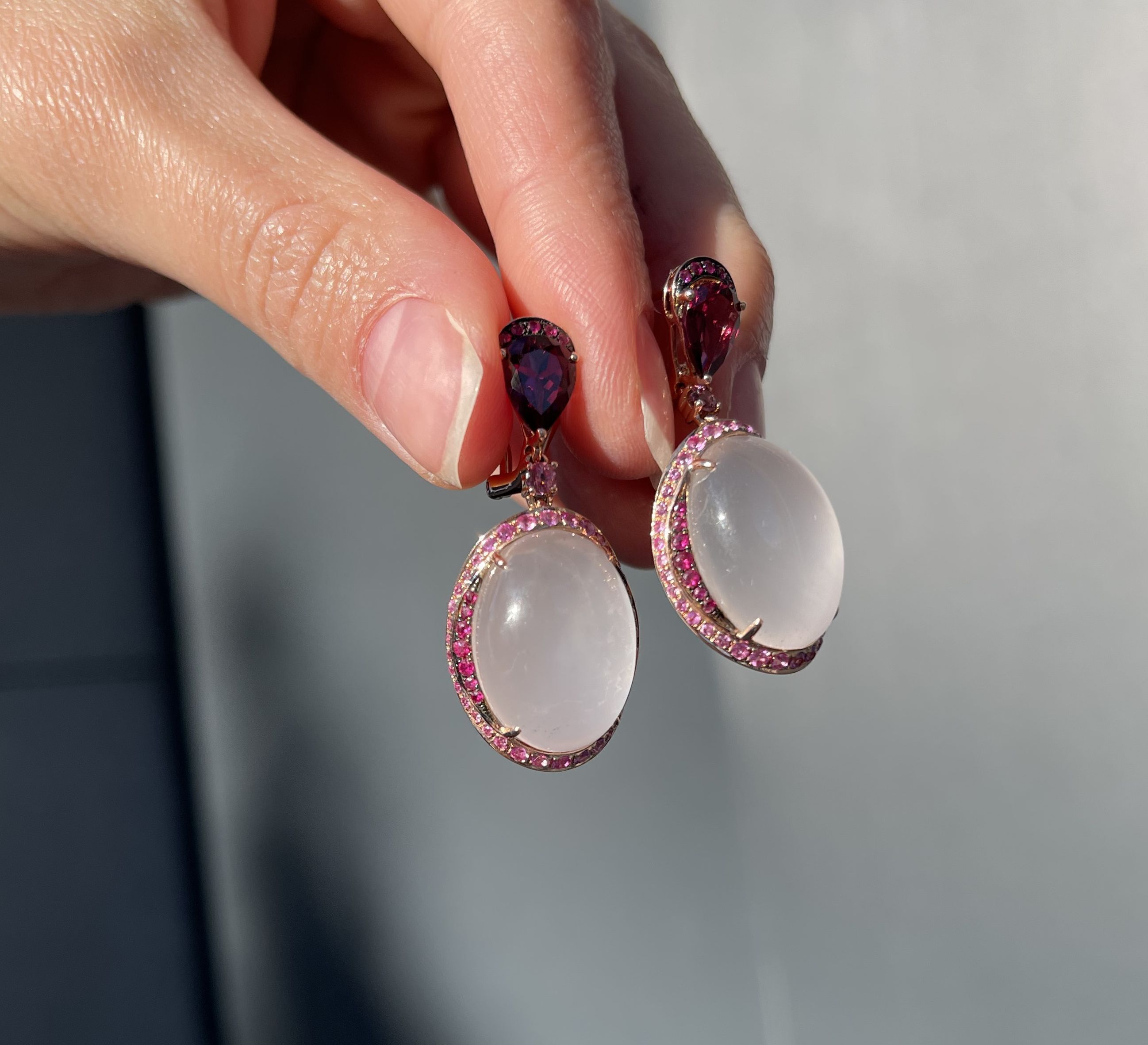 • Серьги из розового золота 585 пробы с дублетами кварц-перламутр, рубинами, сапфирами и родолитами код. 31761