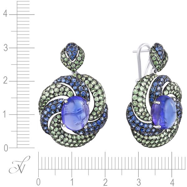Серьги из белого золота 585 пробы с танзанитами, цаворитами и сапфирами код. 37595