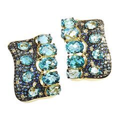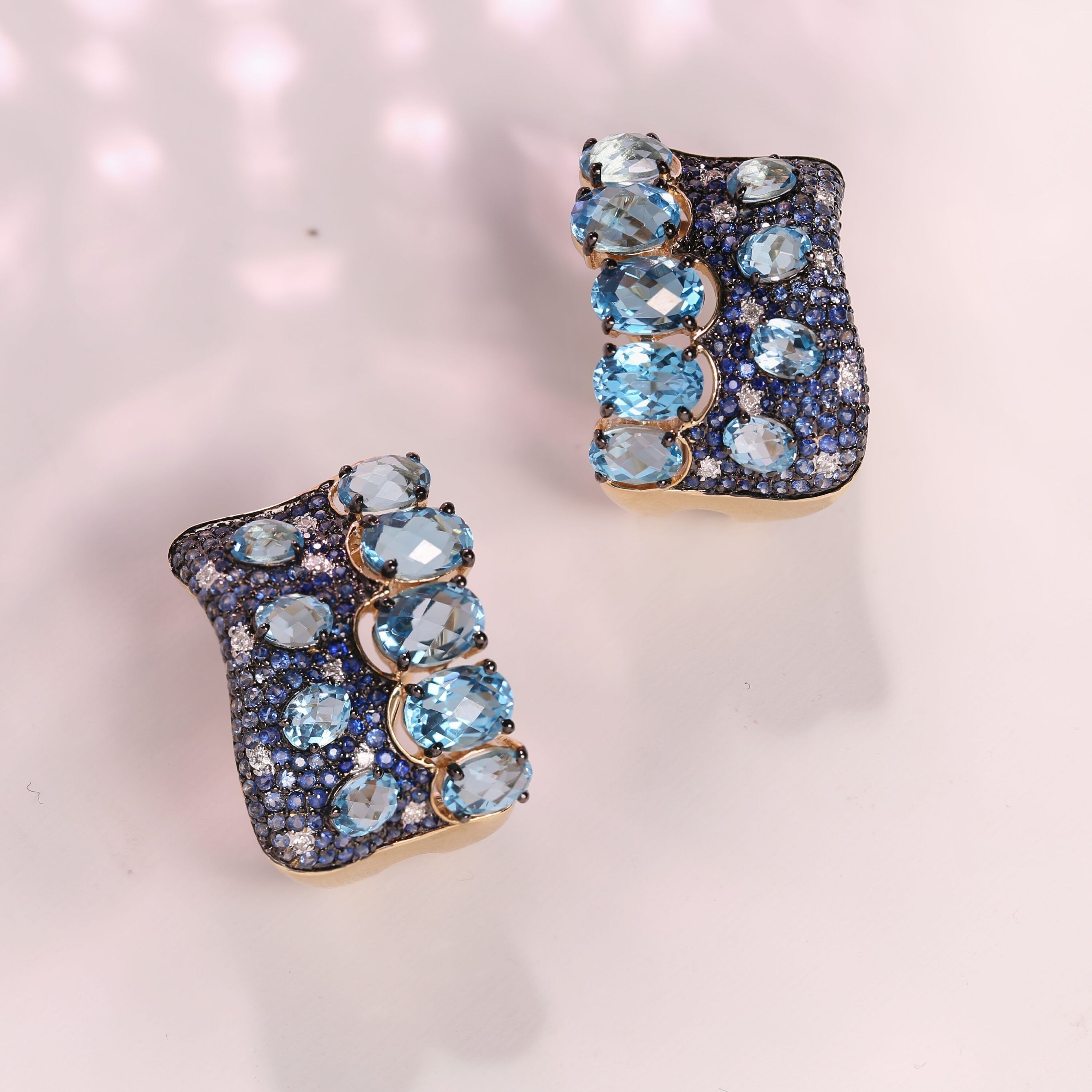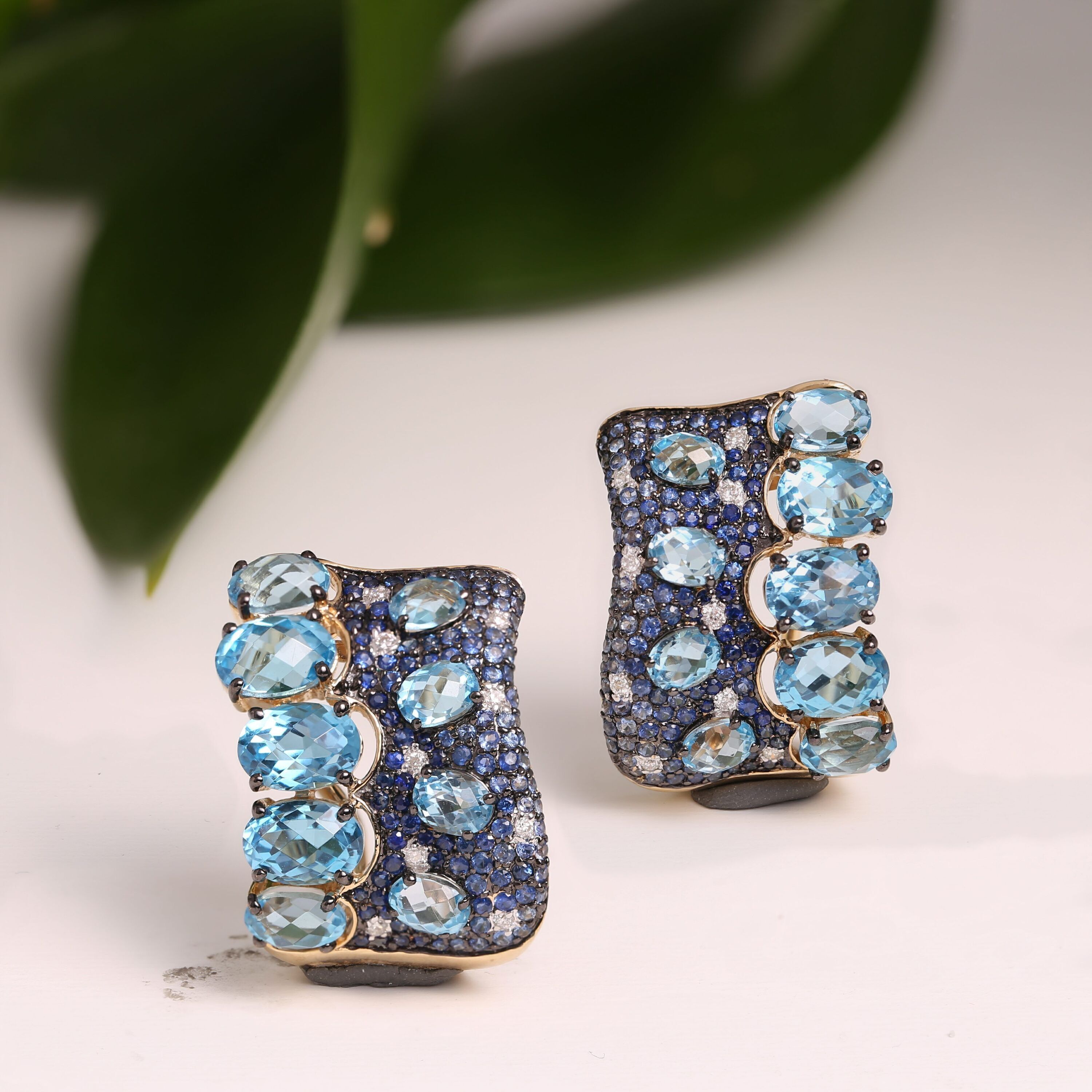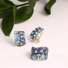 Золотые серьги 585 пробы, камни - бриллиант огранка круглая 57 граней 3/5 - 18шт. вес 0.09 карата, топаз - 18шт. вес 8.98 карата, сапфир 3/г3 - 236шт. вес 1.16 карата
