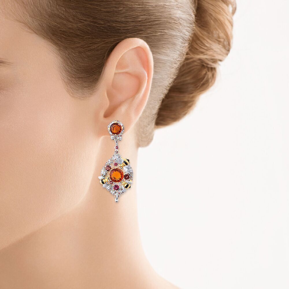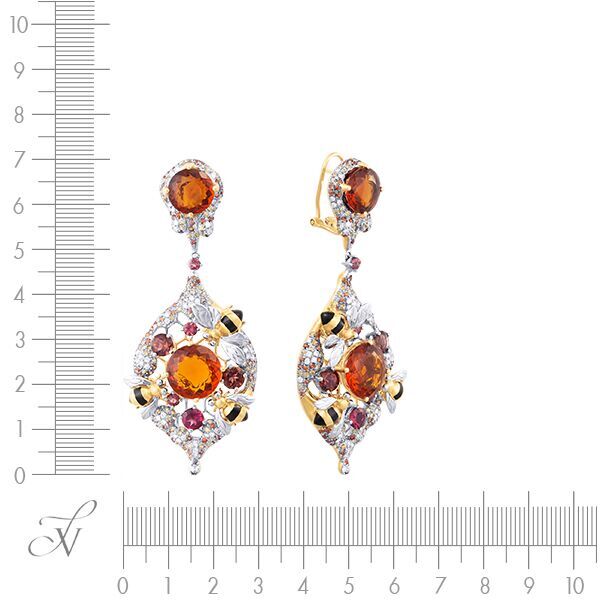 Серьги из золота 750 пробы с бриллиантами, сапфирами, родолитами, цитринами и эмалью (пчела, цветы) код. 57495