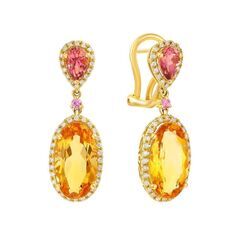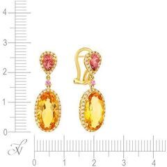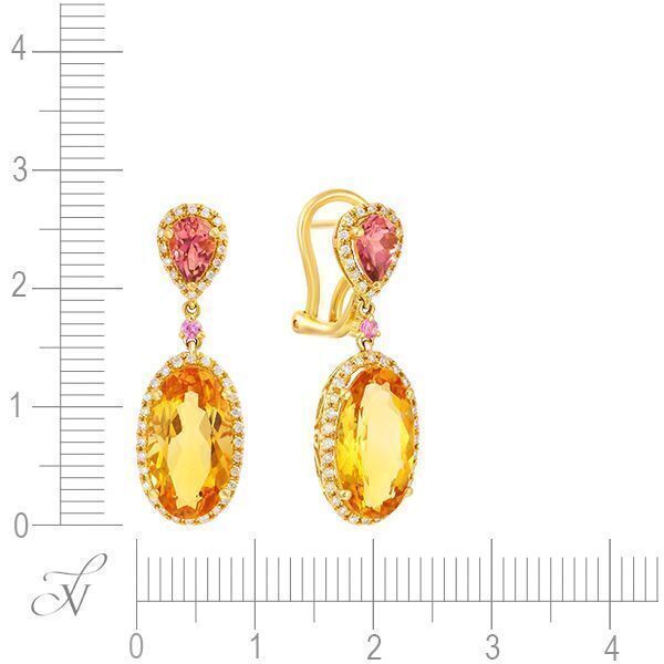 Золотые серьги 585 пробы, камни - бриллиант огранка круглая 57 граней 4/6 - 88шт. вес 0.38 карата, сапфир розовый - 2шт. вес 0.07 карата, турмалин - 2шт. вес 0.90 карата, цитрин - 2шт. вес 6.00 каратов