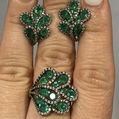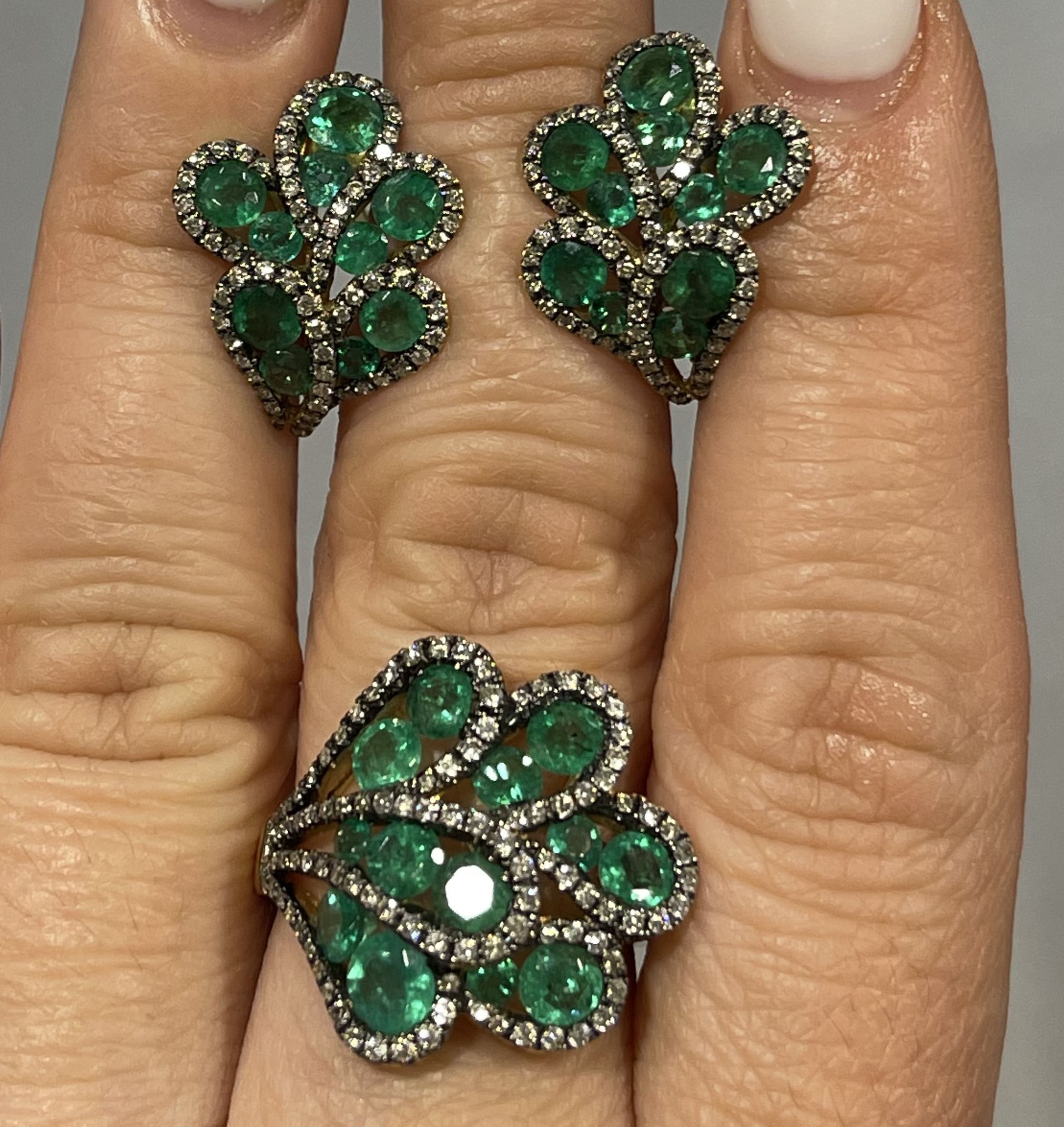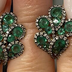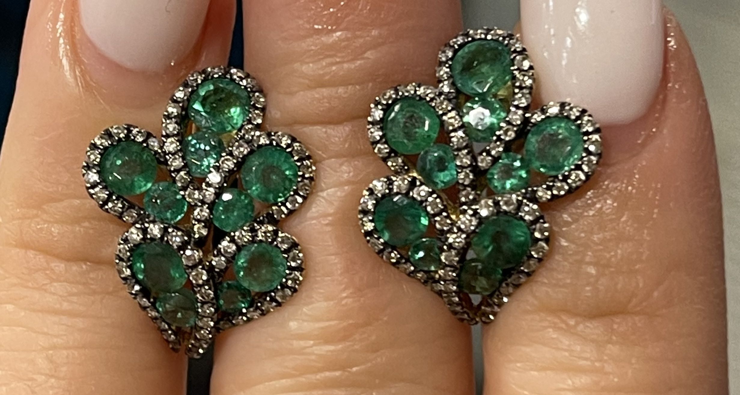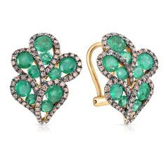 Золотые серьги 585 пробы, камни - бриллиант коричневый огранка круглая 57 граней 6/6 - 136шт. вес 0.67 карата, изумруд 3/г2 - 20шт. вес 3.22 карата