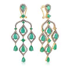 Золотые серьги 585 пробы, камни - бриллиант коричневый огранка круглая 57 граней 6/5 - 218шт. вес 1.25 карата, изумруд 3/г3 - 26шт. вес 6.72 карата