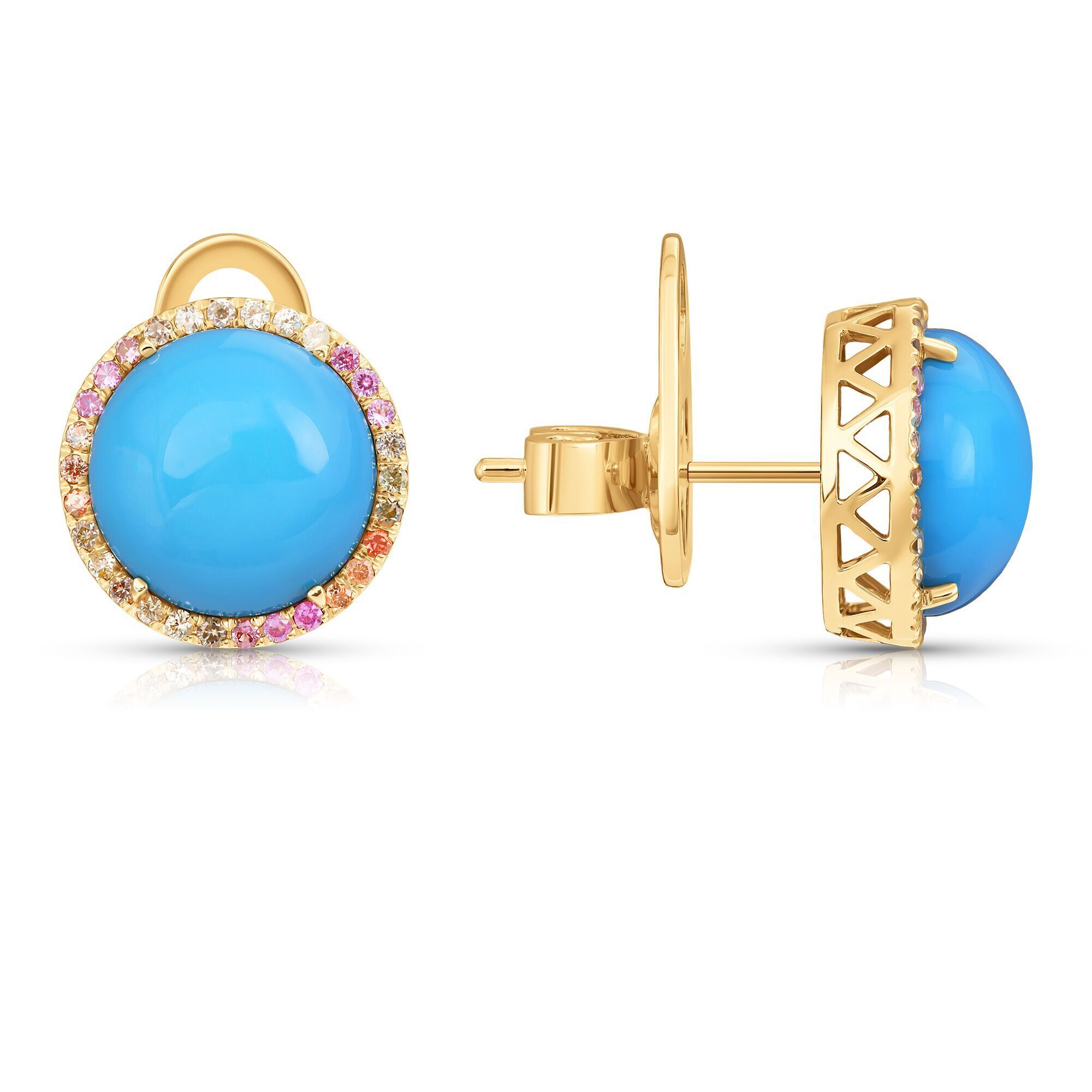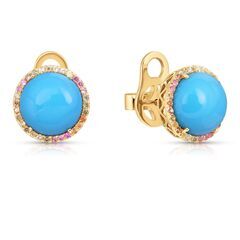 Золотые серьги 585 пробы, камни - сапфир оранжевый - 12шт. вес 0.12 карата, сапфир зеленый - 18шт. вес 0.18 карата, сапфир желтый - 12шт. вес 0.12 карата, сапфир розовый - 18шт. вес 0.18 карата, бирюза голубой - 2шт. вес 7.24 карата
