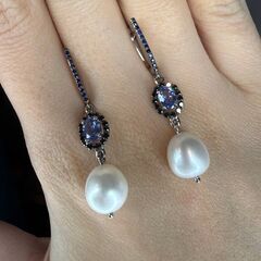 Золотые серьги 750 пробы, камни - бриллиант облагороженный черный огранка круглая 57 граней 7/6 - 28шт. вес 0.36 карата, сапфир синий 4/г3 - 22шт. вес 0.18 карата, сапфир синий 4/г3 - 2шт. вес 1.12 карата, жемчуг речной культивированный белый - 2шт.