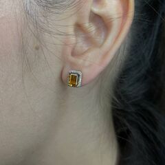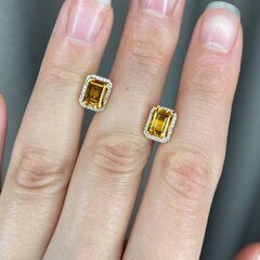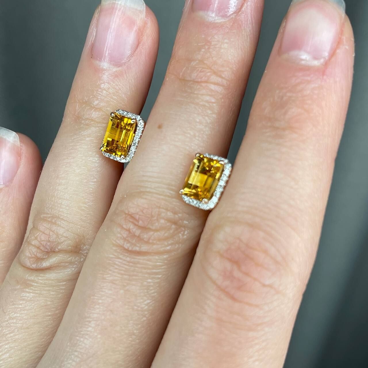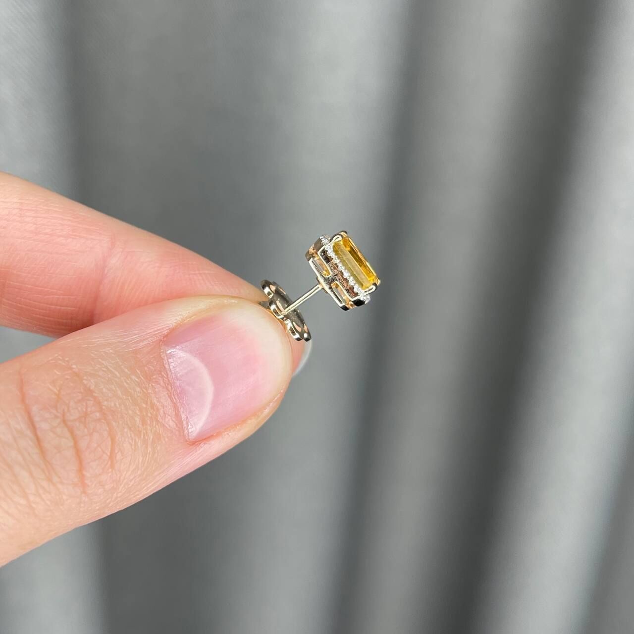 Золотые серьги 585 пробы, камни - бриллиант белый огранка круглая 57 граней 3/5 - 52шт. вес 0.14 карата, цитрин желтый октагон - 2шт. вес 2.03 карата